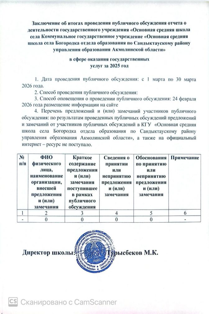 Уважаемые жители Сандыктауского района! КГУ «Основная средняя школа села Богородка отдела образования по Сандыктаускому району управления образования Акмолинской области» доводит до Вашего сведения, что с 1 марта 2026 года на официальном интернет ресурсе http://bogorodka-sand-akm.edu.kz/ будет проводиться публичное обсуждение “Отчета о деятельности в сфере оказания государственных услуг за 2025 год» В связи с изложенным, всех желающих просим принять активное участие в обсуждении.
