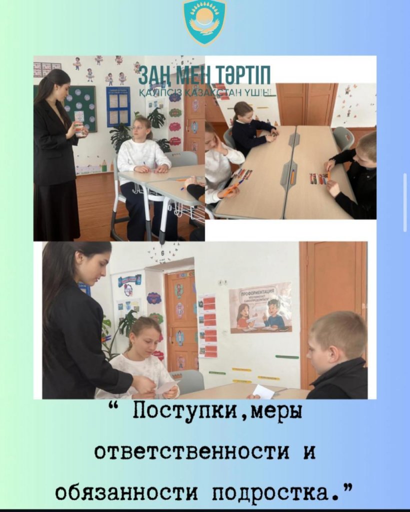 Бесінші сыныпта «Жасөспірімдердің іс-әрекеті, жауапкершілігі, міндеттері» тақырыбында сынып сағаты өтті. Сынып сағатында оқушылар қандай әрекеттерді дұрыс және бұрыс деп санайтынын, өз іс-әрекеті үшін жеке жауапкершілікті және жасөспірімдердің құқықтары мен міндеттерін талқылады.