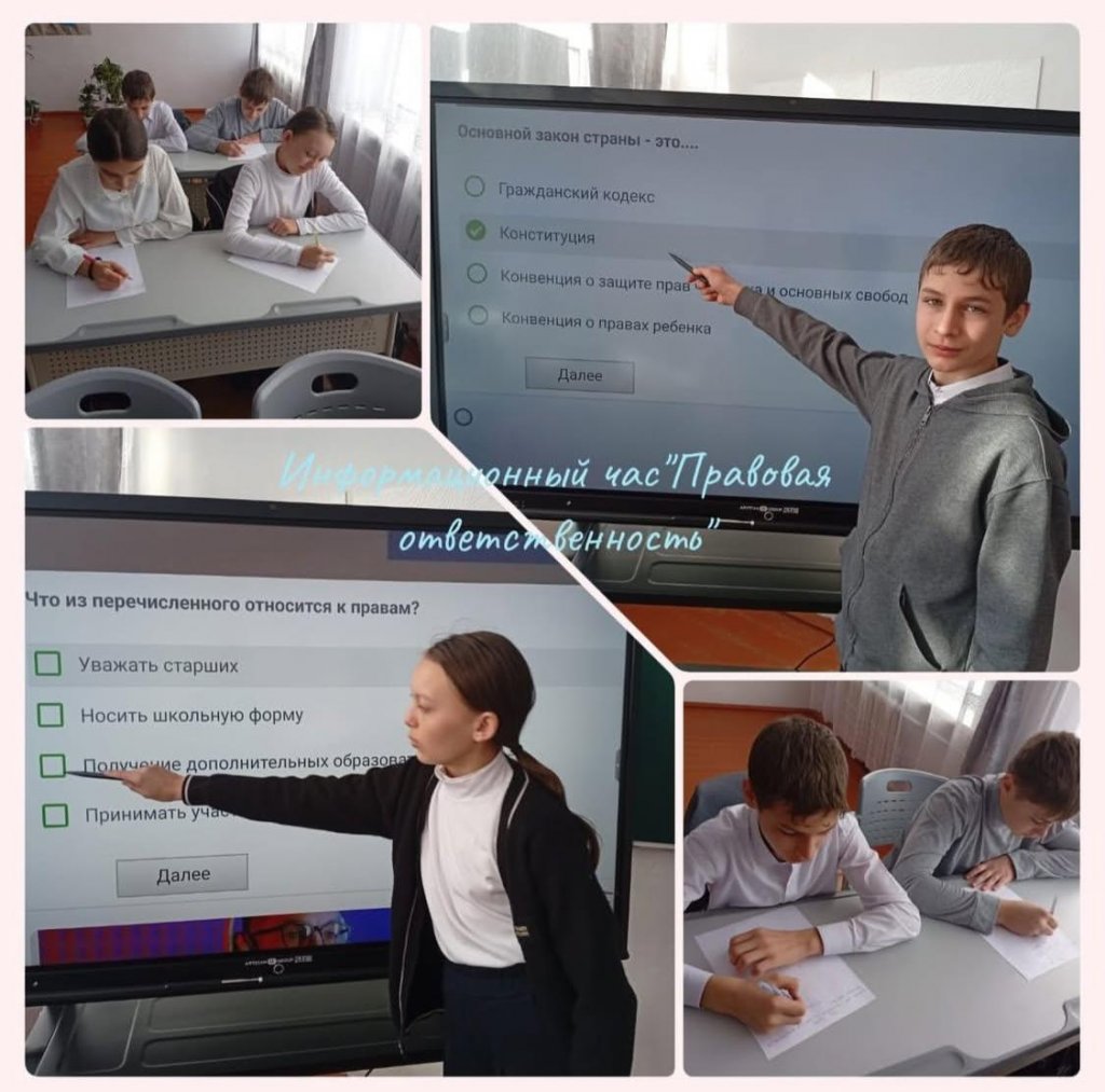 Бүгін 7-сыныпта «Заңды жауапкершілік» тақырыбында ақпараттық сағат өтті. Студенттер заңды жауапкершіліктің негізгі түрлерімен танысты, қандай әрекеттердің салдары болатынын және олардың құқықтары мен міндеттерін білу неліктен маңызды екенін талқылады. Пікірталас барысында студенттер: өмірдегі жағдайларды талдап, теріс қылық пен құқық бұзушылықты ажыратуды үйренді, және заңның әр адамның өміріндегі маңызы туралы қорытынды жасады.